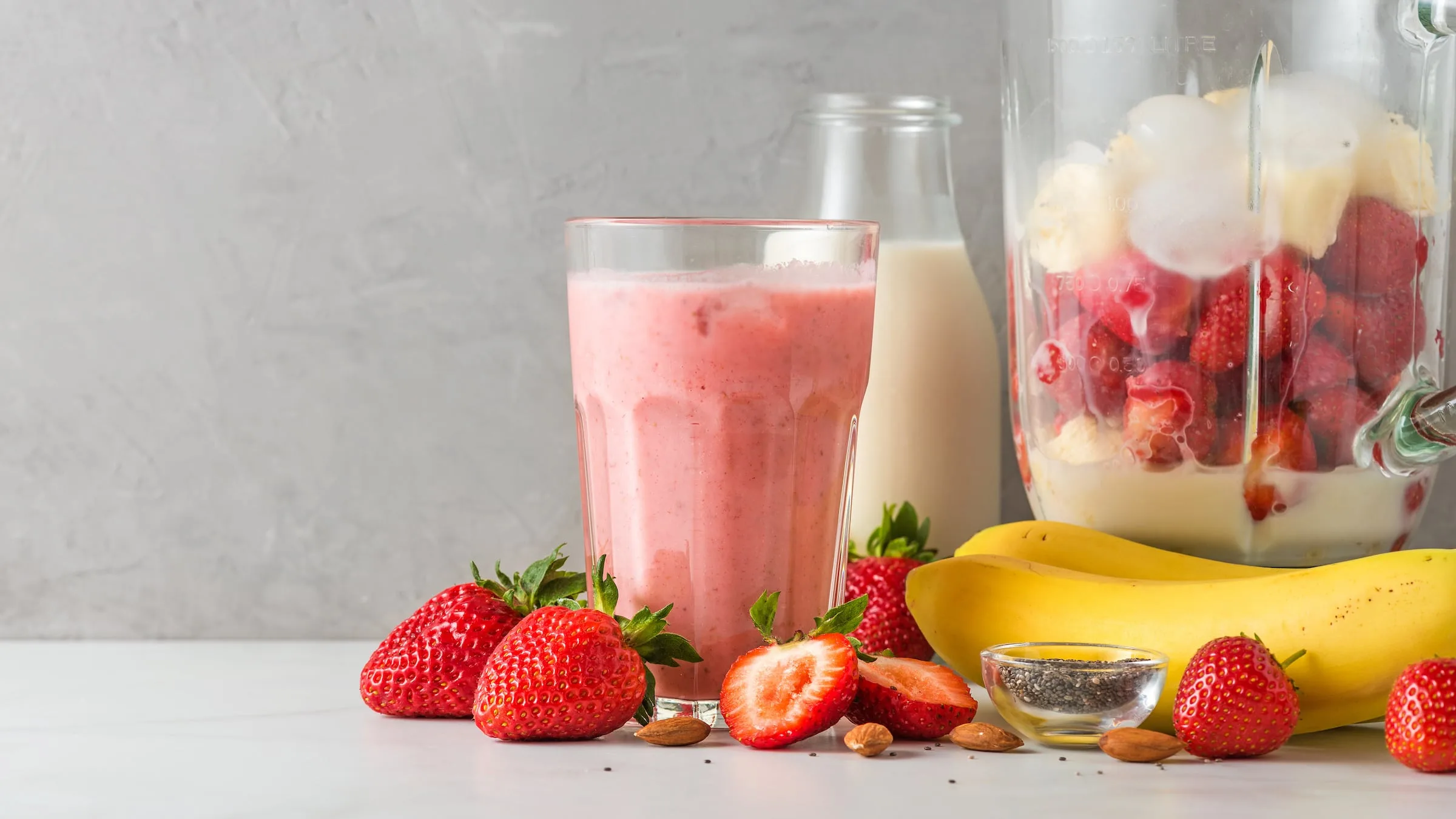 This strawberry smoothie includes Greek yogurt, but can be made vegan by swapping it out for coconut water and ice cubes.