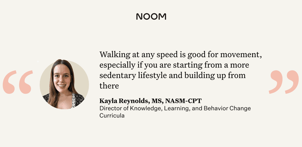 Kayla Reynolds, MS, NASM Certified Professional Trainer, Noom’s Director of Knowledge, Learning, & Behavior Change Curricula, is a big fan of walking. “The simplicity and accessibility of walking make it a powerful tool for increasing activity level,” she says. “It’s a form of movement that many people can integrate into their daily lives and make a habit.”