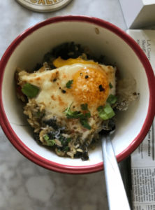 • Eier mit Spinat, etwas Feta: Spinat mit etwas Olivenöl in der Pfanne kurz anbraten, Eier als Rühr-oder Spiegelei dazu, etwas Feta oder Parmesan, mit Salz und Pfeffer würzen, fertig!