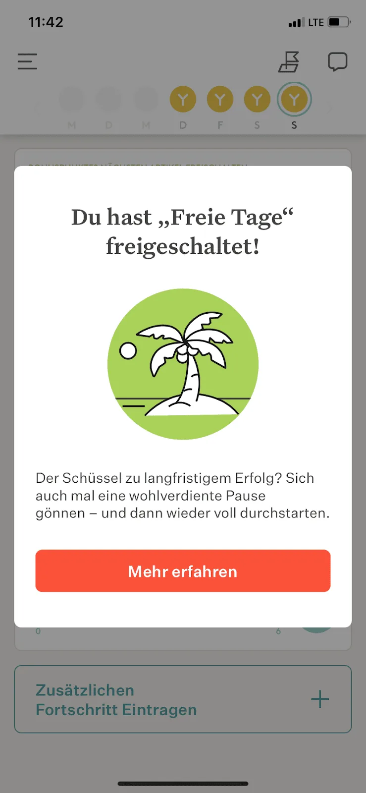 Du kannst auf deine freien Tage zugreifen, wenn du sie zum ersten Mal frei schaltest und auch, indem du auf ‘Fortschritt’ und dann auf Trends‘ und dann auf die Palme tippst. Hier kannst du den Stand deiner freien Tage einsehen und sie planen oder absagen.
