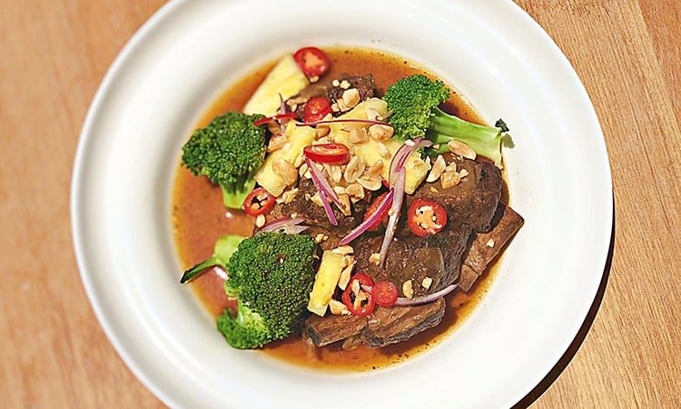 Estofado de res con piña, brócoli cilantro y cacahuates